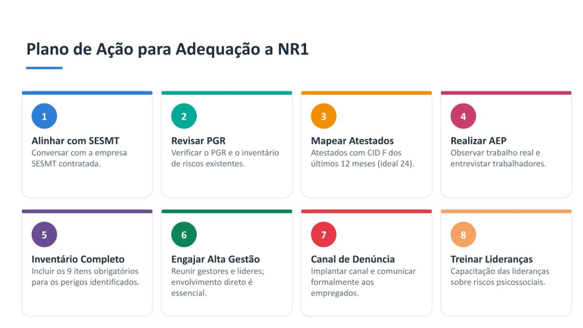 Bruna reforçou que a segurança não deve ser vista apenas como um documento, mas como uma mudança de cultura dentro das instituições. Ela compartilhou um plano de ação em 8 passos para que as organizações façam as adequações à nova NR-1: